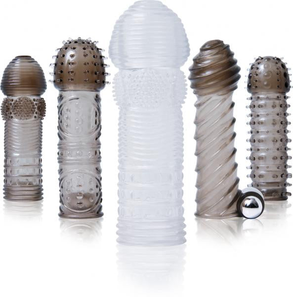 该套装配有5种不同的阴茎增长增粗套,并附带一个振动马达。